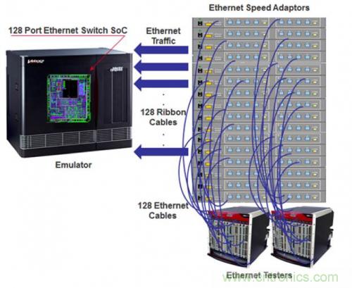 今天,以太網交換機和路由器已達到 256 個端口(到年底將會增加到 1024 個端口),而且它們可處理高達 120 Gb/s 的流量。同時,網絡交換的延遲也在持續下降中,最低延遲已降至 1 µs。所有這些因素促使如今的網絡交換機和路由器芯片成為有史以來最大規模的芯片,達到了五億門級。在流片完成之前驗證此類複雜 IC 設計是一項難以完成的任務。我們來考慮下具有 128 端口以太網接口的 SoC 設計。