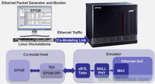 在此場景中,以太網測試儀模型運行於連接到硬件仿真器的Linux工作站上。基於成熟的實現 IP,模型準確再現了實際的物理測試儀。這種虛擬測試儀包括以太網數據包生成器和監視器 (EPGM),可以為 1G、10G、40G/100G 和 120G 網絡分別配置 GMII、XGMII、XLGMII/CGMII 和 CXGMII 接口。每個支持的MII端口都需要一個 xRTL 事務處理器(圖 2)。