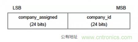 公有地址的構成包含了兩個部分,一部分是公司識別碼(Company ID),其需要通過IEEE注冊機構付費獲得,公司識別碼長度為24比特,處於48比特設備地址的高24比特;另外一部分是公司分配碼(Company Assigned ID),其長度也為24比特,處於48比特設備地址的低24bit,如下圖所示。