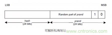 假設有兩個藍牙設備,分別是設備A和設備B,在兩個藍牙設備A、B建立連接之後,這兩個藍牙設備可以通過配對的方式交換各自的身份解析密鑰IRK(Identity Resolving Key, IRK),設備A的身份解析密鑰IRK-A,設備B的身份解析密鑰IRK-B。假設設備B采用了可解析的私有地址機製,那麼設備B就需要周期性的產生可解析的私有地址。下圖是可解析隨機地址的結構,其中可解析隨機地址的高兩個比特分別為0和1,作為可解析地址的標識符。