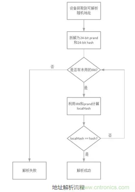 如果生成的本地哈希localHash與拆分得到的哈希hash相等,說明這個地址是設備B所產生的可解析隨機地址;如果不等,代表解析失敗。設備A可以利用其獲取的其他設備的IRK對這個地址就行解析。下圖是一個地址解析的流程圖。