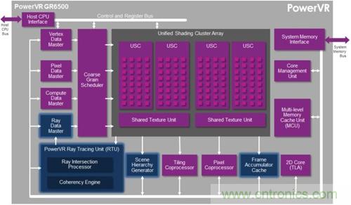 新家族的第一名成員是PowerVR GR6500,基於最新一代的四陣列移動GPU PowerVR Rogue設計而來,整合了PowerVR Series6 XT係列的所有特性,並加入了強大的光線追蹤硬件加速電路。