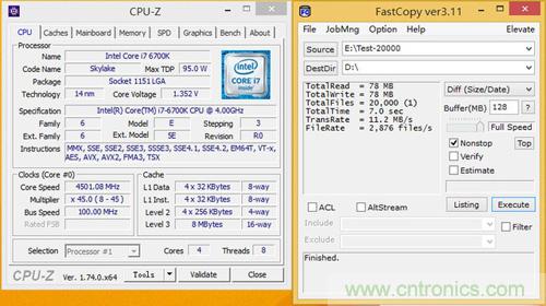 最後我們再來看看CPU頻率對SSD讀寫4KB小文件的速率影響,測試僅以四核1.6GHz和4.5GHz兩種配置成績對比,並開啟CPU超線程技術。為避免性能瓶頸,測試以浦科特M6V SATA 6Gbps SSD作為基準,與三星M.2 SSD 950 PRO互相拷貝4KB小文件,使用Fastcopy記錄讀寫時間和讀寫速率。(測試文件包包含20000個4KB TXT文檔)
