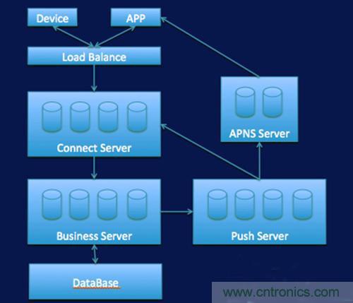 看一下最簡單的IM架構,這裏麵要保持長連接,接下來做一些業務處理,下麵是存儲,如果App要去控製Device的時候,發到業務層處理完了之後,這裏麵有一個推送的,可以找到Device到底連了哪一台機,然後再把數據推送過來。如果Device自己的狀態發生變化,它的數據要推送給APP,基本上是這樣的工作流。如果App是黑莓等設備的,我們可能要專門推送到APNS裏麵來。