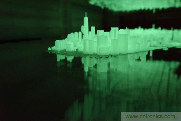 這些城市街區是用3ds Max和Rhino軟件設計之後,再用能夠在黑暗中發光的半透明線材3D打印的。這其中的每個模型都經過了精心設計使之盡可能地與真實保持一致。除此之外,Huang還會偶爾在個別細部的地方秀一下自己的幽默感,比如他就3D打印了一個金剛並將其放到了自由塔上。