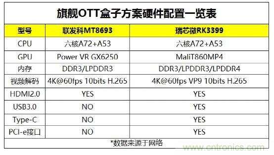 超高規CPU與GPU,可秒殺目前市場主流的海思Hi3798、海思3798C V200、全誌H8、晶晨S905、聯發科MT8693等產品。而性能與RK3399差距不算太大的晶晨S912,目前量產時間仍待定,因此在整體盒子芯片環境中,RK3399目前尚無對手。