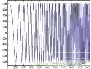 根據上麵的程序,取調頻斜率為400,頻率控製字為10,幅度量化為10位(和所使用的D/A配合),相位累加器為24位,用Matlab仿真得到的線性調頻信號的波形和相應的幅頻響應如圖3和圖4所示。