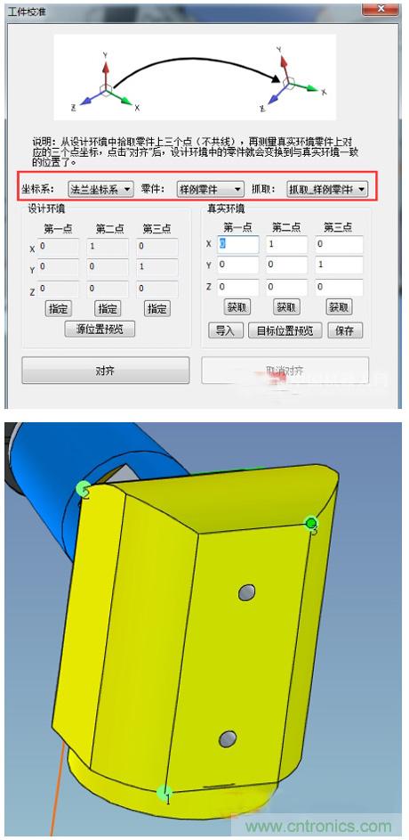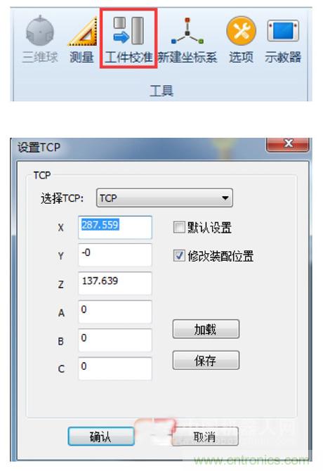 然後,我們對零件的三維模型進行工件校準以及對工具的TCP進行設置,完成此步驟後零件和工具的位置就已經和實際的位置保持一致了。