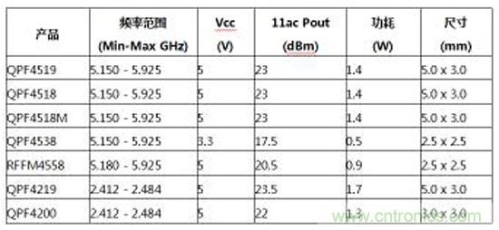 新的Qorvo FEM支持最新一代802.11ac和Wave 2 1024QAM家居Wi-Fi產品,功耗比現今市麵同類產品低2瓦特。這足以使一些Wi-Fi聯網設備的風扇變得不必要,進一步降低功耗,減小尺寸。5 GHz FEM現在提供樣片;2.4 GHz型號將在2017年一季度推出。下表總結了新Qorvo Wi-Fi FEM係列的規格。