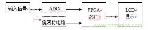 將輸入的模擬信號分成2路,一路經ADC輸入FPGA 芯片 ,另一路經斯密特電路輸入給FPGA 。FPGA外接20MHz的晶振,通過FPGA 內部的鎖相環倍頻至200MHz,即周期為5ns的方波信號。用此方波信號作為時間基準,對經斯密特電路輸入信號的周期進行測量,得到被測信號周期=N*5ns,則等效采樣的時間間隔=m*(N*5ns)+5ns。根據等效采樣原理,此時的采樣率相當於1/5ns=200MHz,利用LCD顯示技術,可以看到此效果。