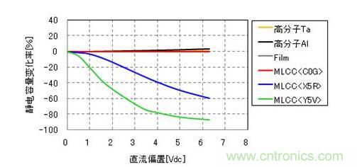 直流偏置特性是指,對電容器施加直流電壓時實際靜電容量發生變化(減少)的現象。這種現象是使用了鈦酸鋇係鐵電體的高介電常數類片狀多層陶瓷電容器特有的現象,導電性高分子的鋁電解電容器(高分子AI)和導電性高分子鉭電解電容器(高分子Ta)、薄膜電容器(Film)、氧化鈦和使用了鋯酸鈣係順電體的溫度補償用片狀多層陶瓷電容器(MLCC
