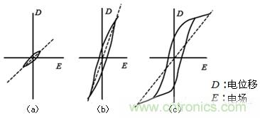 如上所述,鐵電體陶瓷的結晶粒(Grain)有分域(Domain),各個自發極化(Ps)的方向是隨機的,整體上相當於無極化的狀態。在此之上施加電場(E)shi,dianchangfangxiangshangchanshengjihua,dadaobaohezhi。zaizhezhongzhuangtaixiajishiquchudianchang,jihuafangxiangyebuhuihuidaoyuanlaiwuxusuijidezhuangtai,duoshaohuitingliuzaijihuashidezhuangtaishang,xingchengcanliujihua,zaiwaibuxianxian。weilerangzhezhongcanliujihuaguiling,xuyaofanfangxiangdedianchang。nidianchangjinyibuzengqiangshihuifashengjihuafanzhuan,xiangxiangfanfangxiangjinxingjihua。leisizheyangdeyinwaibudianchangeryinqidetiediantidejihuadongzuorutu4的D-E曆史曲線(磁滯曲線)。