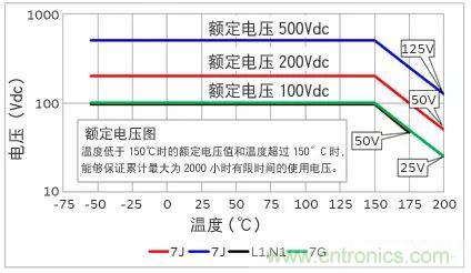 產品溫度超過150℃時,請按照下麵的額定電壓降低施加在電容器上的電壓再使用。