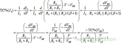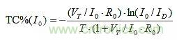TC%(I0) = TC%(IE)的設定可以建構如下。R0上的唯一變化來自VBE。因此,由T引起的I0的分數變化是: