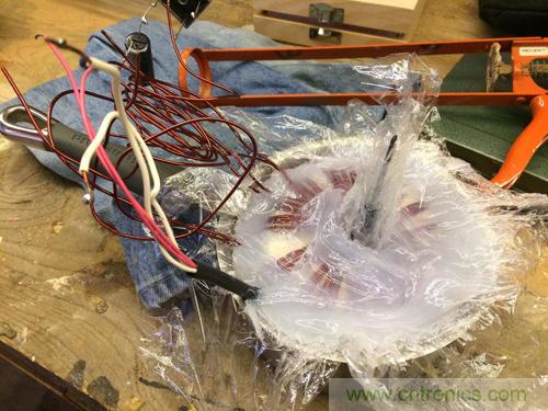 使用環形線圈,我快速構建好一個半波供電電源來測試DC-DC模塊。在負載下,變壓器的嗡嗡/蜂鳴噪雜聲是相當大的。我又想起幾年前為一個有源音箱定製環形線圈的經曆。第一次灌封時有點噪雜聲(隻是一點點),盡管環形線圈的噪聲不算大。第二次灌封時,我告訴製造商使用環氧樹脂來灌封“甜甜圈”的孔洞。這下一點噪聲都沒有啦,真絕。