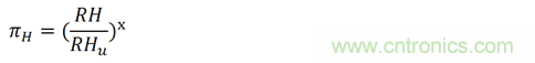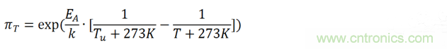 公式中,αf為測試的加速因子,也就是加速(後綴為a)測試條件下MTTF(Mean Time To Failures,平均無故障時間)與參考(後綴為u)測試條件下MTTF之比。EA是活化能,在0.79eV和0.95eV之間,k為玻爾茲曼常數。指數x為相對濕度的影響,指數y為電壓的影響,都是經驗數據,但是必須通過實際評估來確認。我們把此加速模型擴展到壽命預估模型中。