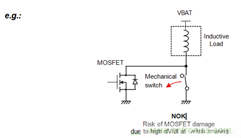 當MOSFET處於關閉狀態時,開關的開啟會導致MOSFET的破壞:由於機械開關的短暫時間,高的dvdt會激活在MOSFET中包含的寄生晶體管。浪湧的能量將集中在這種寄生晶體管上;這可以破壞寄生雙極晶體管,並破壞MOSFET本身。MOSFET在漏極源和源極之間的絕對短路損壞。