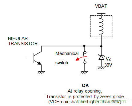 1.使用一個雙極晶體管,用一個穩壓二極管保護來限製振蕩電壓,其值低於VCEmax。39vzener電壓是接受拋負載的推薦值。