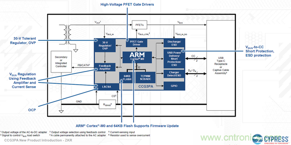 如圖2所示,CCG3PA具有高集成度,與通過使用分立組件實現的功能等效係統相比,具有組件數量更少、電路板占位麵積更小、電路板布局更簡單以及材料成本和PCB成本更低的優勢。