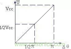 不同的Δθ,有不同的直流分量Vd。Δθ與V的關係可用圖4來描述。從圖中可知,兩者呈簡單線形關係:Ud = Kd *Δθ (2)Kd 為鑒相靈敏度