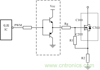 如果選擇MOS管寄生電容比較大,電源IC內部的驅動能力又不足時,需要在驅動電路上增強驅動能力,常使用圖騰柱電路增加電源IC驅動能力,其電路如圖 2虛線框所示。