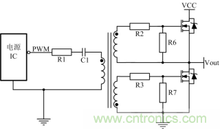 為了滿足如圖 5所示高端MOS管的驅動,經常會采用變壓器驅動,有時為了滿足安全隔離也使用變壓器驅動。其中R1目的是抑製PCB板上寄生的電感與C1形成LC振蕩,C1的目的是隔開直流,通過交流,同時也能防止磁芯飽和。