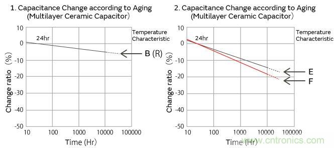 高誘電係的積層陶瓷電容器的靜電容量,以經過125℃以上的熱處理24小時後的值作為基準,與時間成對數關係直線性下降。請參考如下村田製品靜電容量老化特性的代表例子。