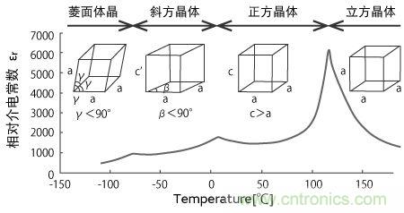 圖2:隨溫度結晶構造及介電率的變化(BaTiO3係)