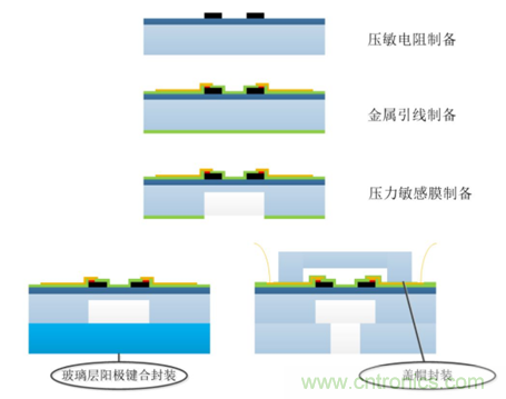 SOI高溫壓力傳感器的製備工藝涉及多道MEMS工藝,此處簡單介紹一些關鍵步驟以供了解傳感器的工藝過程,如圖3所示,主要包括壓敏電阻製備、金屬引線製備、壓力敏感膜製備以及壓力腔封裝等工藝。