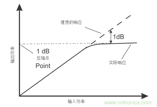 第二種規格,輸出1dB壓縮點,實際上非常類似於最大線性輸出電壓和電流的概念。它也被稱為P1dB,在該點上,放大器從理想狀態下增益壓縮到1分貝的輸出功率級。圖1介紹了該概念,其中,實線表示測得的信號,虛線表示理想的信號。有時,一些測量將P1dB點與輸入而非輸出對照,這應在計算中予以考慮。