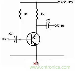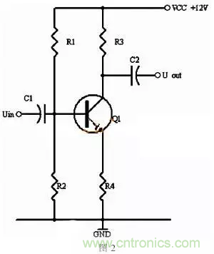 同理,當輸入信號減小時,則Ib減小,Ic電流減小,則電阻R2的電壓U2=Ic×R2會隨之減小,Uce=VCC-U2,會變大。在輸入信減小時,Uce最大變化是從1/2的VCC變化到VCC。這樣,在輸入信號一定範圍內發生正負變化時,Uce以1/2VCC為準的話就有一個對稱的正負變化範圍,所以一般圖1靜態工作點的設置為Uce接近於電源電壓的一半。