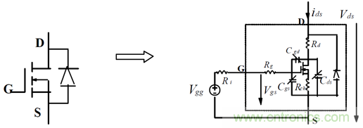 實際的功率MOSFET 可用三個結電容,三個溝道電阻,和一個內部二極管及一個理想MOSFET 來等效。三個結電容均與結電壓的大小有關,而門極的溝道電阻一般很小,漏極和源極的兩個溝道電阻之和即為MOSFET 飽和時的通態電阻。