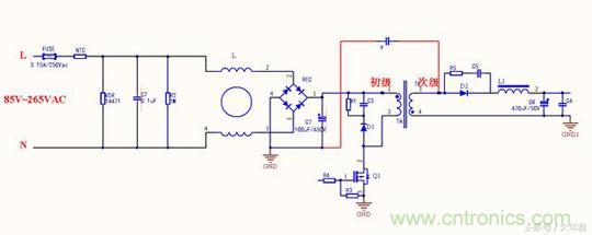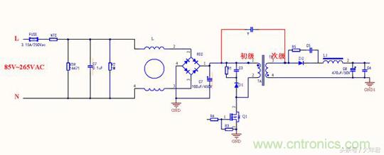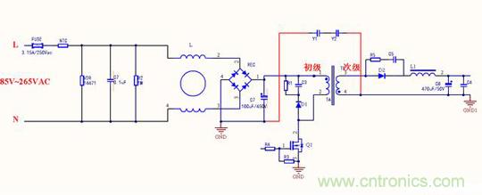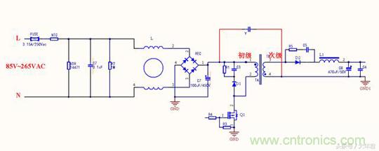 變壓器的每個線圈繞組之間有寄生電容存在,在工作時過程當中形成電壓,成為噪聲源頭,在初始高壓與次級地之間跨接Y電容,能濾除初級和次級耦合產生的共模幹擾,這與第一種差不多,隻是在EMI測試時候結果會有所不同。