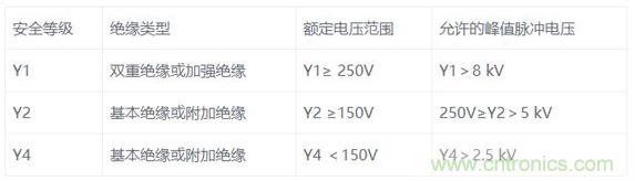 我們都知道Y電容是安規電容,是跨接L線地以及N線與地之間的電容,它的作用是抑製共模幹擾。現在一共有三種等級,分別是是Y1, Y2, Y4。由於漏電流不能太大這是安規要求,漏電流太大人體觸摸用電器會有一種麻麻的感覺,因此一般Y電容容量大小為1nF到4.7nF之間。