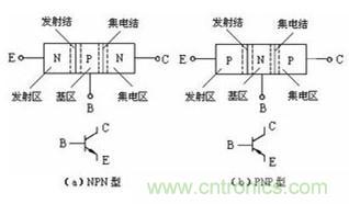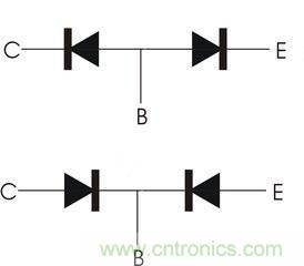 2.發射結和集電結都是屬於pn結,具備pn結的特性,因此其結構相當於一個極(陰極和陰極或者陽極和陽極)並聯在一起的兩個二極管,這個公共的電極就是基極,而另外兩個極就是集電極和發射極;見圖二,上麵的對應的是npn型三極管,下麵的對應的是pnp型三極管;