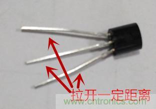 1.首先將三極管的三個管腳前後或者左右拉開一定距離,以便於測量;這樣可以避免表筆短路,如下圖三所示: