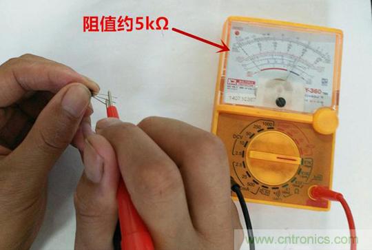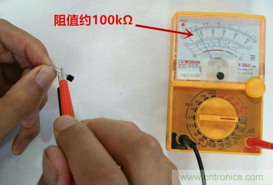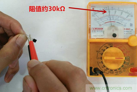 2.然後用拇指和食指捏住基極和另一個腳(假定該腳為集電極),方法同上,記錄顯示值R2;