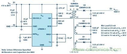 LT8304-1 反激式轉換器設計采用的組件較少。圖 1 顯示一款完整的 4 V~28 V 輸入至 1000 V 輸出解決方案,其能夠支持 15 mA 負載。輸出電流能力 隨著輸入電壓的增加而提高,當輸入電壓高於 24 V 時可達到 13mA。由於 LT8304-1 可通過原邊波形檢測輸出電壓,因此無需配置大尺寸高電壓分壓器,也不必采用光耦合器。