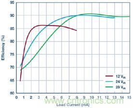 圖 2:圖 1 所示轉換器在各種不同輸入電壓條件下的效率。
