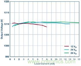 有關 LT8304-1 周圍組件所承受之電壓和電流應力計算的說明,詳見 LT8304-1 的數據手冊。值得注意的是,這款 1000 V 解決方案采用了一個在副邊具有 3 個分離輸出繞組的變壓器。原邊至副邊匝數比為 1:10:10:10,而不是單副邊繞組 1:30 匝數比變壓器。1:10:10:10 變壓器使得輸出電壓應力可在 3 個高電壓輸出二極管和 3 個高電壓輸出電容器之間分擔。單個組件的電壓額定值隻需為總電壓的 1/3,因而有利於獲得更多可供選擇的輸出二極管和輸出電容器。圖 2 顯示這款峰值效率達到 90.5% 的反激式轉換器。即使未采用光耦合器,各種不同輸入電壓下的負載調節仍然很緊,精度通常為 2% 至 3%,如圖 3 所示。