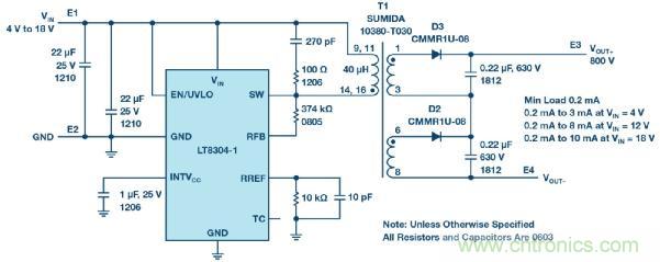 圖 4:一款提供 4 V 至 18 V 輸入的完整 800 V/10 mA 隔離型反激式轉換器。