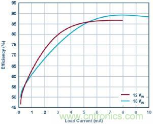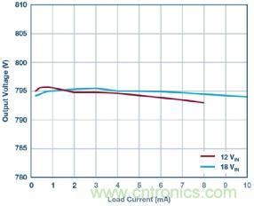 圖 4 顯示一款完整的 4 V~18 V 輸入至 800 V 輸出解決方案,其能夠提供高達 10 mA 的輸出電流。當輸入為 18 V 和負載電流為 10 mA 時,該反激式轉換器可實現 88.2% 的峰值效率。圖 5 顯示各種不同輸入電壓下的效率曲線;圖 6 顯示了卓越的負載調節性能。另外,該解決方案采用的組件較少。