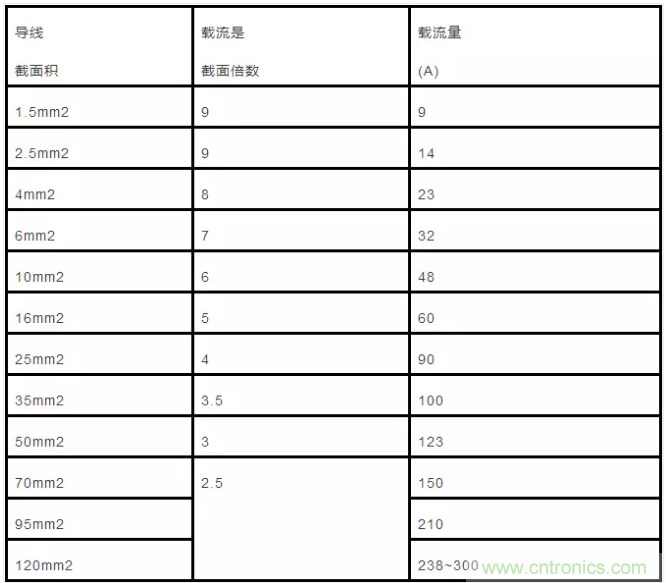 2.5mm’及以下的各種截麵鋁芯絕緣線,其載流量約為截麵數的9倍。如2.5mm’導線,載流量為2.5×9=22.5(A)。從4mm’及以上導線的載流量和截麵數的倍數關係是順著線號往上排,倍數逐次減l,即4×8、6×7、10×6、16×5、25×4。