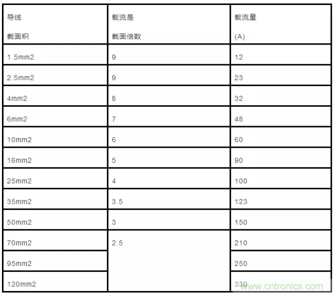 嚴格要求就用導線截麵積乘以4作為載流量。載流量小,導線就要得多,成本就高。為了降低成本,又保證安全,很多家裝在不是封閉布線時就采用導線截麵積乘以5倍或者6倍來提高導線的載流量。