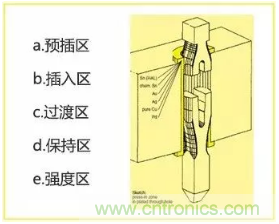 業界為 Press-fit 端子設計了各種形態,這些形態各有優缺點。其中,魚眼孔端子是應用最為廣泛的 Press-fit 端子結構。通常一個典型魚眼孔端子分 5 個區域(如上圖所示)。