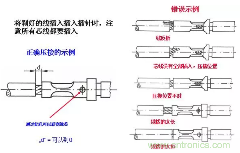 插入時要留意長短深度。線纜插入過短容易導致端接達不到規定的拉拔力,因為線纜與端子之間的金屬間接觸減少了;而er線xian纜lan插cha入ru過guo深shen則ze會hui縮suo短duan連lian接jie器qi的de使shi用yong壽shou命ming。以yi車che針zhen壓ya接jie為wei例li,當dang第di一yi個ge窗chuang口kou可ke以yi觀guan察cha到dao金jin屬shu線xian芯xin,第di二er個ge窗chuang口kou可ke以yi觀guan察cha到dao線xian纜lan外wai皮pi時shi,表biao示shi線xian芯xin的de位wei置zhi是shi剛gang好hao的de。