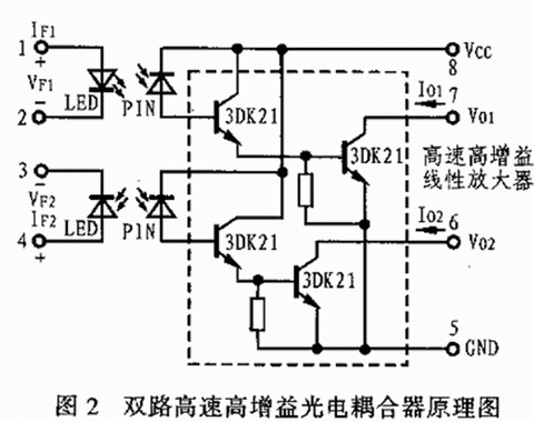 近幾年來,國內有關單位投入大量人力物力也研究和開發了各種光電耦合器件。如上海半導體器件八廠、上shang海hai無wu線xian電dian十shi七qi廠chang等deng。而er重zhong慶qing光guang電dian技ji術shu研yan究jiu所suo為wei了le適shi應ying市shi場chang需xu要yao研yan製zhi出chu了le一yi種zhong由you高gao速su響xiang應ying發fa光guang器qi件jian和he邏luo輯ji輸shu出chu型xing光guang接jie收shou放fang大da器qi組zu成cheng的de厚hou膜mo集ji成cheng雙shuang路lu高gao速su高gao增zeng益yi電dian耦ou合he器qi。這zhe種zhong光guang電dian耦ou合he器qi的de輸shu入ru端duan由you兩liang隻zhiGaAIAs側麵發光管組成,其輸出端由兩隻Si—PIN光電探測器以及兩個高速高增益線性放大電路組成。圖2所示為其原理電路圖,除此之外,重慶光電技術研究所還研製出了高速高壓光電耦合器、GG2150I型射頻信號光電耦合器、GG2060I型高壓脈衝測量光電耦合器、GH1204U型高壓光傳輸光電耦合器以及 GH1201Y型和GOHQ-I型光電耦合器等。