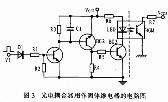 采用光電耦合器作固體繼電器具有體積小、耦合密切、驅動功率小、動作速度快、工作溫度範圍寬等優點。圖3所示是一個光電耦合器用作固體繼電器的實際電路圖,它的左半部分電路可用於將輸入的電信號Vi變成光電耦合器內發光二極管發光的光信號;而(er)右(you)半(ban)部(bu)分(fen)電(dian)路(lu)則(ze)通(tong)過(guo)光(guang)電(dian)耦(ou)合(he)器(qi)內(nei)的(de)光(guang)敏(min)三(san)極(ji)管(guan)再(zai)將(jiang)光(guang)信(xin)號(hao)還(hai)原(yuan)成(cheng)電(dian)信(xin)號(hao),所(suo)以(yi)這(zhe)是(shi)一(yi)種(zhong)非(fei)常(chang)好(hao)的(de)電(dian)光(guang)與(yu)光(guang)電(dian)聯(lian)合(he)轉(zhuan)換(huan)器(qi)件(jian)。圖(tu)中(zhong)所(suo)用(yong)的(de)光(guang)電(dian)耦(ou)合(he)器(qi)的(de)電(dian)流(liu)傳(chuan)輸(shu)比(bi)為(wei)20%,耐壓為150V,驅動電流在8~20mAzhijian。zaishijishiyongzhong,youyutameiyouyibandiancijidianqichangjiandeshijijiedian,yincibucunzaijiechubuliangheranhudahuodengxianxiang,yebuhuiyinshouwailihuojixiechongjieryinqiwudongzuo。suoyi,tadexingnengbijiaokekao,gongzuoshifenwending。