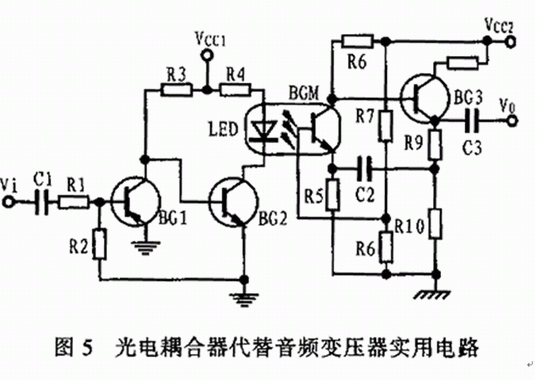 目前,利用光電耦合器代替音頻變壓器的應用電路有多種形式,圖5所示是比較實用的一種。當輸入信號Vi經三極管BG1、BG2前級放大之後,驅動光電耦合器左邊的LED發光,並被右邊的光敏管全部吸收並轉換成電信號,此信號經後級電路BG3放大,並由該管的發射極通過電容器C3後輸出一個不失真的放大信號 V0。youyugaidianlujiangqianhouliangjifangdaqizhijianwanquangeli,yinerdujueledihuanlukenengyinqideganrao。tongshiyouyugaidianluhaijuyouxiaozaogongneng,yincibimianlexinhaodeshizhen。zhenggedianludezongzengyikewangdadao20dB以上,帶寬約120kHz。