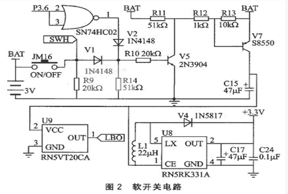 與圖1相比較,用JM16鍵開機後,還必須利用單片機P3.6 輸出低電平實現開機自保,因此稱該電路為“軟開關電路”。shiyonggairuankaiguandianludeyoudianshiwuxukaolvanjianqudoudongwenti,yingjiandianlujiandan,kejiangdiyingjianchengben,jieyueyinzhibanbanmian,zaishouchishichanpinzhongyinzhibanbanmianshifeichangbaoguide(元器件的數量直接影響印製板的大小和產品整體外觀)。缺點是當受到外界強信號幹擾或由於電池電量不足而引起死機時,按鍵JM16將jiang不bu起qi作zuo用yong,必bi須xu取qu出chu電dian池chi,再zai重zhong新xin裝zhuang入ru方fang能neng解jie決jue死si機ji現xian象xiang。當dang然ran這zhe種zhong情qing況kuang出chu現xian的de機ji率lv極ji低di,且qie因yin電dian池chi電dian量liang不bu足zu而er引yin起qi死si機ji時shi,就jiu需xu要yao更geng換huan電dian池chi了le。而er圖tu1的硬開關電路中,當碰到死機現象時,無需觸摸電池,通過按鍵JM2就能實現開機和關機。